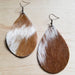 Add rustic charm to your accessories collection with these stunning Leather Teardrop Earrings in Tan and White Hair. Crafted from genuine leather, these earrings feature a unique hair-on-hide texture with a beautiful tan and white pattern. Perfectly suited for both boho and western-inspired outfits, they are available in two sizes for a perfect fit.
