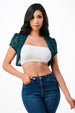 The open front design with cap sleeves creates a chic, flattering silhouette, while the soft, stretchy fabric ensures comfortable wear. Ideal for evening outings, casual gatherings, or a polished daytime look, this versatile shrug is the perfect addition to your wardrobe.