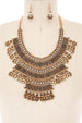 The matching drop earrings complete the ensemble, creating a cohesive look that blends traditional artistry with modern statement style. Crafted with a vintage-inspired antique gold finish, this set is lightweight yet impactful, making it a versatile accessory for bohemian dresses, ethnic wear, or elegant evening outfits.
